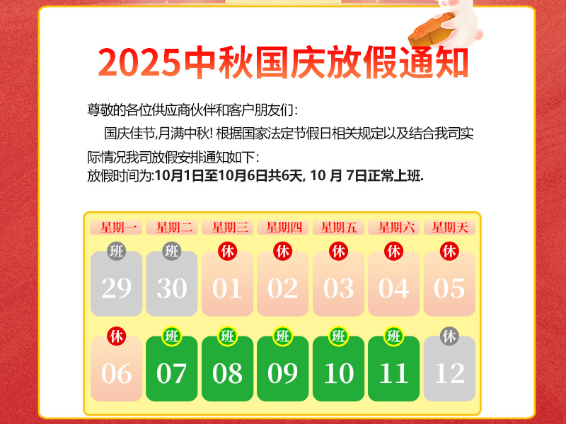尊敬的各位供應(yīng)商伙伴和客戶(hù)朋友們:國(guó)慶佳節(jié),月滿(mǎn)中秋!國(guó)慶家園月圓人團(tuán)園,國(guó)慶中秋雙節(jié)共歡騰!在此預(yù)祝大家度過(guò)一個(gè)輕松、愉快的假期.根據(jù)國(guó)家法定節(jié)假日相關(guān)規(guī)定,再結(jié)合我司實(shí)際情況,現(xiàn)將2025年國(guó)慶中秋節(jié)放假安排通知如下:放假時(shí)間定為10月1日至10月6日(星期三至星期一),共計(jì)6天.2025年 10月 7日(星期二)正式上班,假日期間如有業(yè)務(wù)需求可電話(huà)咨詢(xún)業(yè)務(wù),感謝大家的理解與配合!秋高氣爽迎中